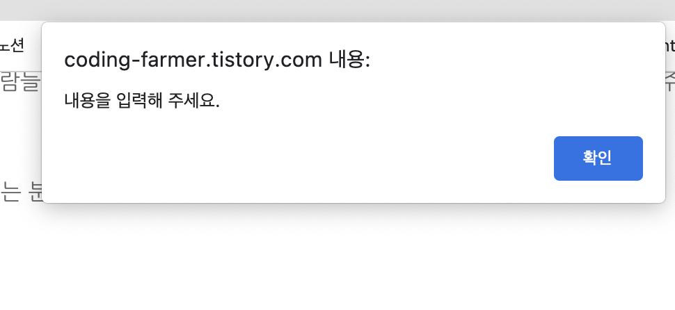그러면 티스토리 프론트엔드 개발자가 구현해놓은 것을 한번 볼까요? 제가 댓글에 1글자도 안쓰고 버튼을 눌러보겠습니다.